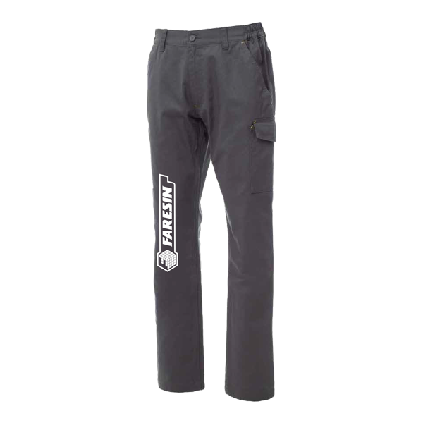 Spodnie robocze z wieloma kieszeniami wykonane z bawełny o gramaturze 210 g drill, ukryta kieszeń na miarkę, kieszeń na zamek bezpieczeństwa, szlufki na pasek i elastyczna talia. Kolor: szary.
